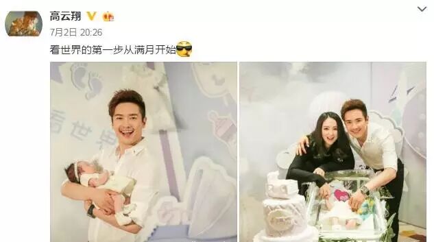 高云翔也发微博称:“看世界的第一步从满月开始”,一并晒出两张照片。这也是“小酒窝”继出生之后第一次公开曝光,在照片中,她被爸爸高云翔紧紧地抱在怀中,非常可爱。