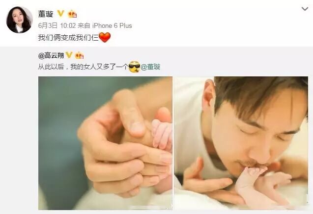 今年6月初,董璇和高云翔的爱女“小酒窝”降生,新任奶爸发微博称:“从此以后,我的女人又多了一个。”言语间全是浓浓的傲娇和父爱。