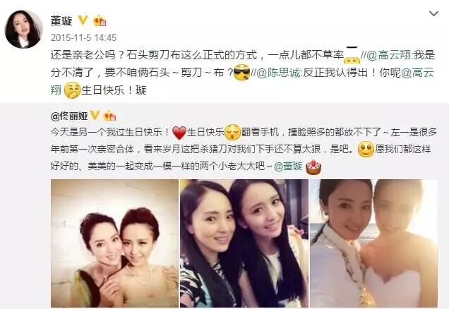 董璇与佟丽娅因为长相如孪生姐妹,私下两家关系非常亲密,经常在微博互动,他们还曾公开表示要定娃娃亲。