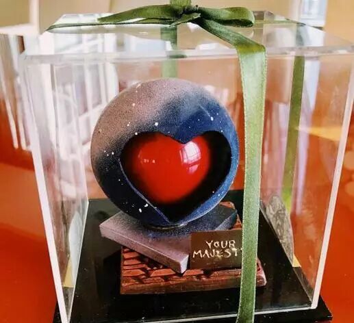 敲开红色圆球会倒出爱心型巧克力,十分精致。