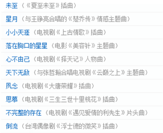 这些年,郁可唯为很多热播剧都演唱过主题曲,从大家熟悉的《小时代》主题曲《时间煮雨》,到《古剑奇谭》的片尾曲《远方》、《青云志》的插曲《青衣谣》、《麻雀》的推广曲《风中芭蕾》、《夏有乔木 雅望天堂》的推广曲《时光正好》、《楚乔传》的情感主题曲《星月》……