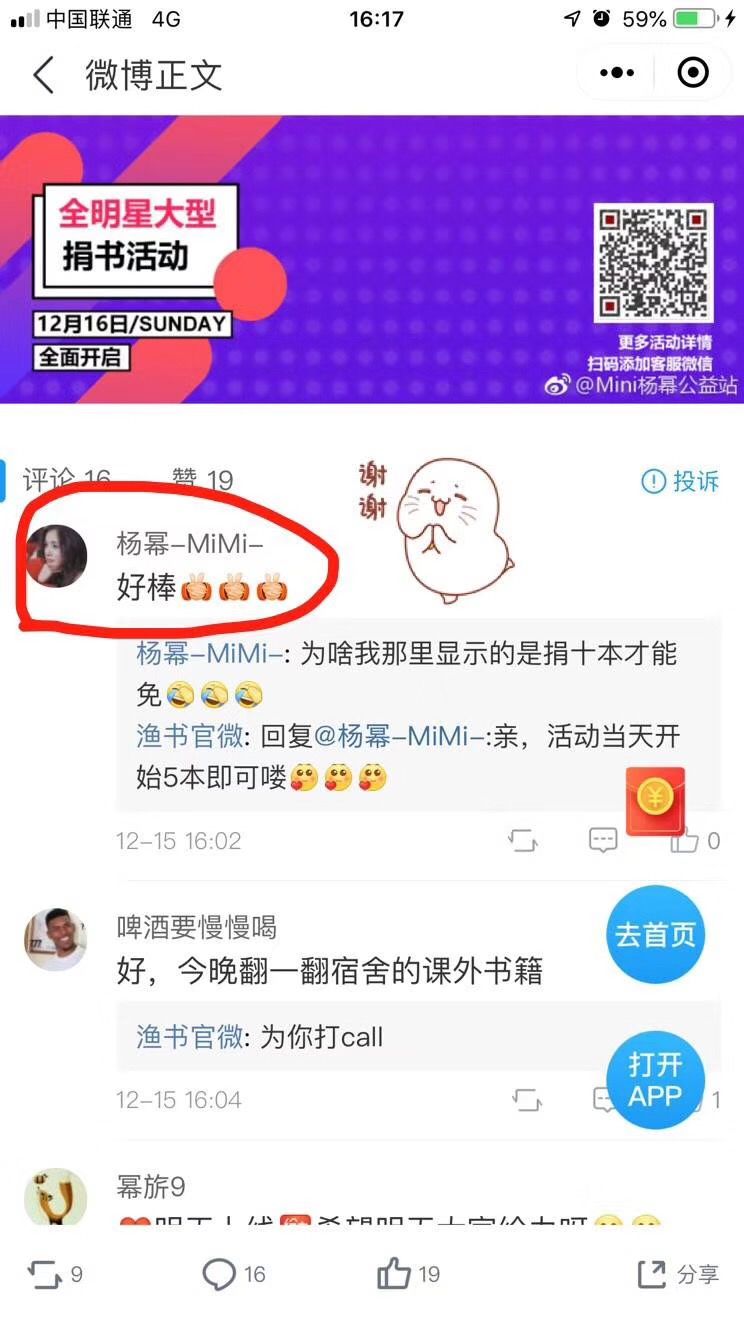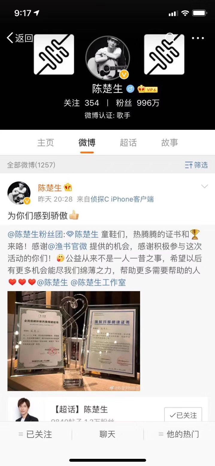 2018年12月启动“星动·渔书”全明星型【线上捐书】活动以来,除了千千万万的普通人,还有@陈楚生粉丝团、@Mini杨幂公益站、@霍建华微吧等12家明星后援团积极参与,在明星后援团的号召下,8天覆盖2.3亿用户,微博话题阅读量达789.3万。