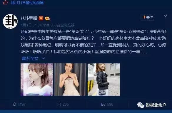 16——17年,原本的阵容里天娱的明星也就只有江映蓉、华晨宇、圈9、超级女团,但最终出现在跨年舞台上的只有华晨宇和超级女团,华晨宇人气飙升逐渐被更多人认可,这次终于唱满了2首歌。超级女团仅仅是作为开场嘉宾张天爱的伴舞出现。但作为跨年的元老级人物的江映蓉,精心准备了一个月的节目却被无情拿掉,人已经到了现场,彩排了一次就被告知不用来了。而新晋超女冠军圈9专门找了古风乐队排练的歌曲也被无情毙掉,跨年夜在大街上给粉丝做直播。当然,这次由于场地限制和总局施压,确实出现了必须点倒数后晚会直接结束的情况,被砍掉的艺人也不止天娱的,但从被砍掉的顺序来看,还是让人心寒。徐良和汪苏泷是最早确定被砍的艺人,到了深圳还没去彩排就被砍掉,于是团队赶快发了微博告知,造成了主动退出的假象保住了面子,而胡彦斌虽然有令人信服的理由——母亲生病而“退出”跨年,但实际上湖南卫视巴不得让这位还没正式签完演出合同的艺人走掉,还不用付钱了。真正让人痛心的是江映蓉和圈9带着舞队和乐队来到现场彩排后却在演出前一天节目被拿下,对外也没法高姿态的宣布是主动退出,也来不及接别的通告了,这两位天娱的冠军待遇竟是如此,而跨年夜主持人还在信誓旦旦的宣布17快男举办的消息,还有人敢来吗?而且他们宁可保留合约不在天娱的16超女亚军方圆,也要优先砍掉天娱的快女超女冠军,可见是多么轻视。当然了,最后方圆以及陈粒、王晰其实更惨,妆都化好了却还是没能上台,全程陪跑。还有最受瞩目的上了热搜的吴昕(以及SNH48)节目于31日下午被砍,芒果砍节目无非是看那些人需要赔的违约金少,那些人粉丝少闹不起来,吴昕会上热搜估计是他们始料未及的。有趣的是,江映蓉点赞了一条关于“心疼吴昕节目被砍”的微博,算是小小的声援吧。