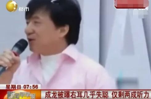 成龙早年间在国外拍摄电影《龙兄虎弟》时因为头部受伤而导致右耳听力受损,随着年龄增长,他右耳的听力不断下降,在几年前拍摄韩国综艺时,主动与主持人刘在石提及自己的右耳听力,说大约只有两成可用。