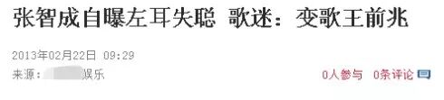 曾经在《凌晨三点钟》被称为“R&B小王子”的张智成在2013年微博上自嘲说,左耳听力受损严重,要去看医生。随后经纪人确认张智成确实听力受损。