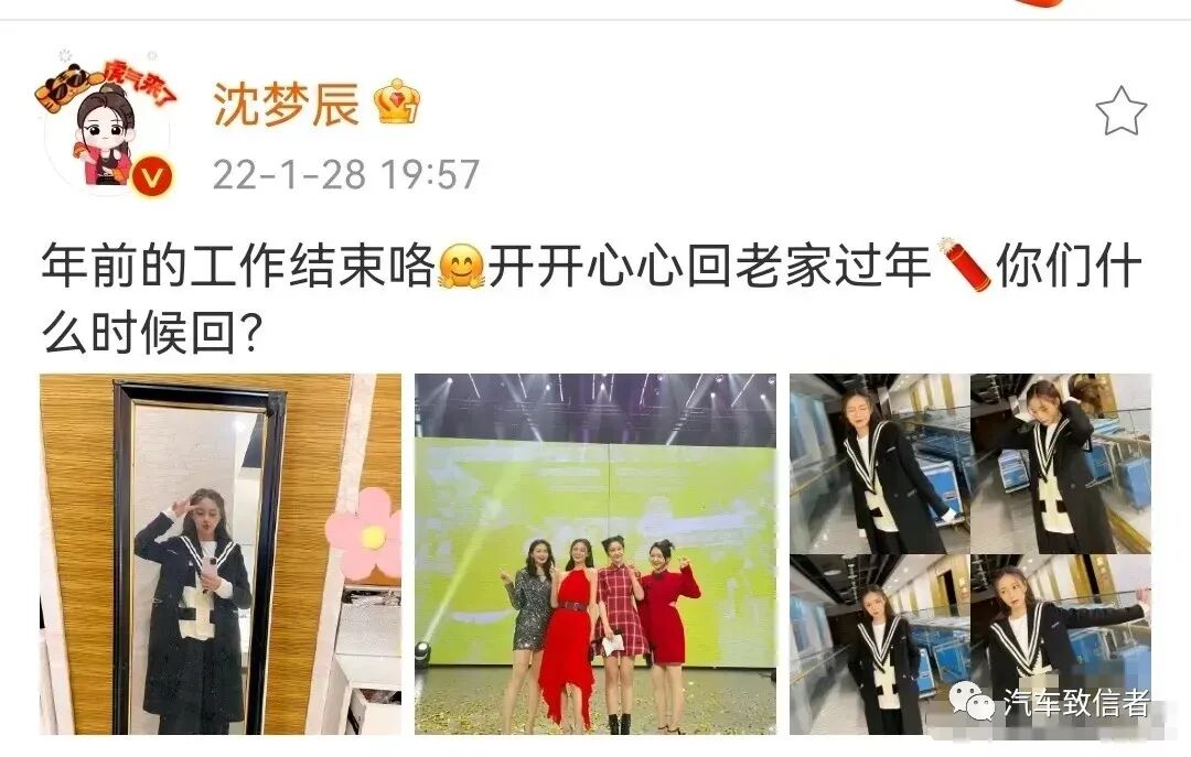 就在今年的一月底,结束工作的沈梦辰在个人的社交平台上写道:年前的工作正式结束,开开心心回老家过年。