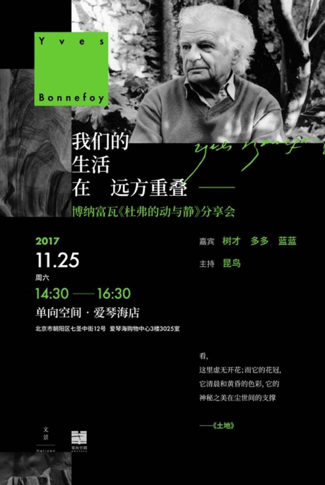 博纳富瓦的“杜弗”是变幻的、神秘的,但它也是根本的、直接的——它本来就和我们每个人有关。在翻译的过程中,译者树才先生也数次拜访了博纳富瓦,二人对诗歌、译诗等话题的讨论,也再一次渗透进译者对诗歌本身的领悟之中。如果你着迷或困惑于“杜弗”的形象,如果你好奇有关博纳富瓦的一切话题,不妨来听听诗集译者和著名诗人多多、蓝蓝的看法。