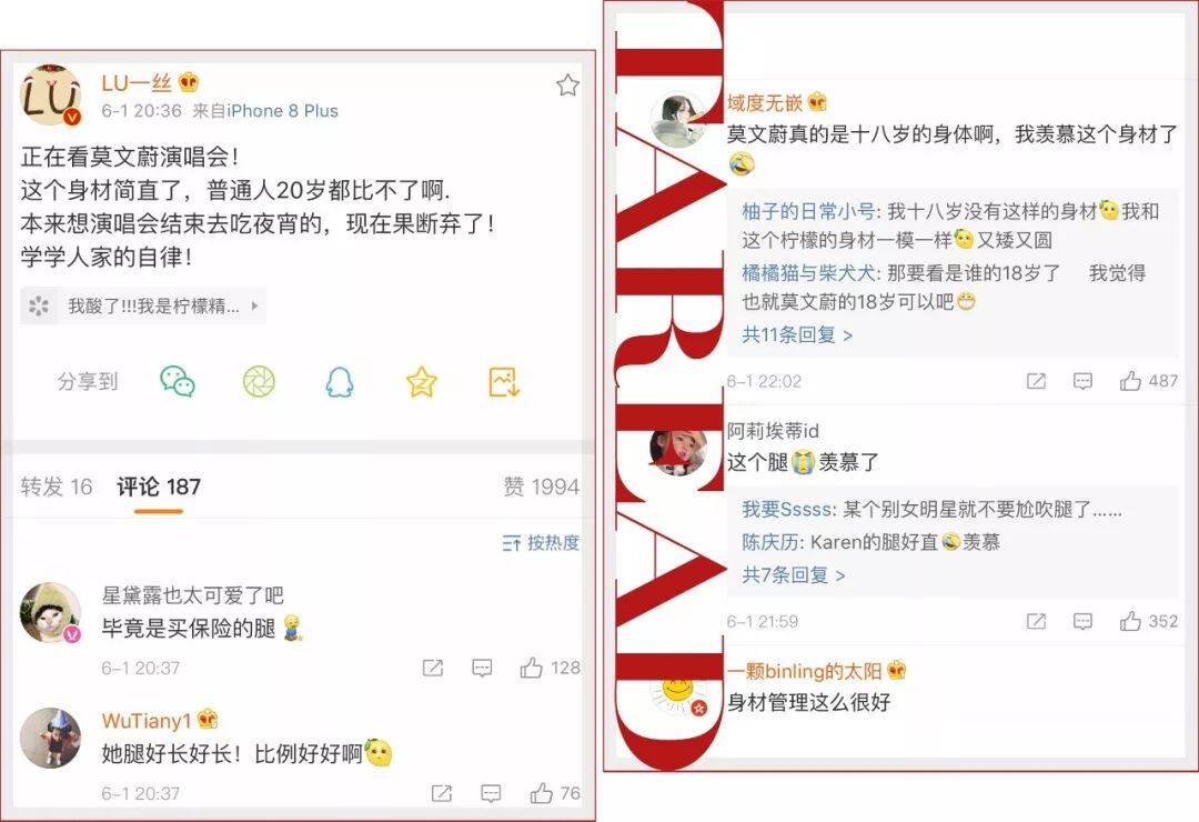 美妆博主LU一丝,在看演出中途也不禁发博感叹莫文蔚的身材。