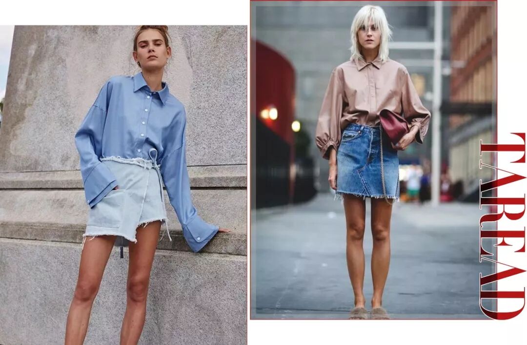 利用oversized衬衫+牛仔裙的搭配,能迅速提升时髦度,上半身在视觉上打造出的纸片人效果叠加下半身大面积露腿效果,超级适合上胖下瘦的妹子穿。