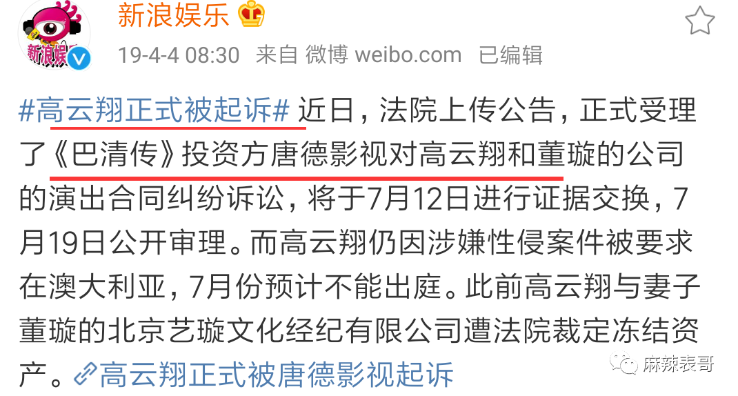 所以,目测他们离婚,更大的可能是因为高云翔惹上官司,被《巴清传》投资方正式起诉↓↓↓