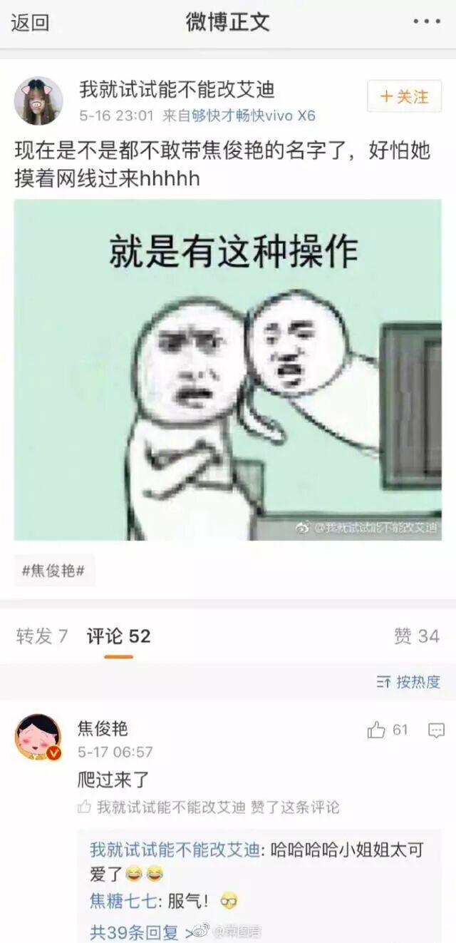 没艾特自己、没带自己话题的微博也能摸过去评论,看来焦俊艳是在微博上没事就搜自己的名字啊~