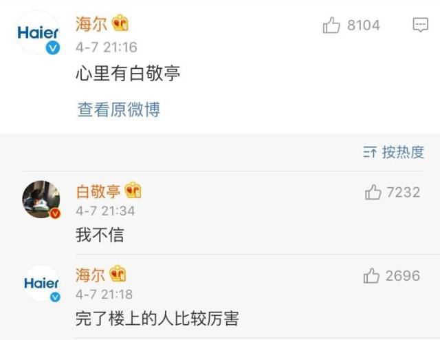 有一次海尔试图抢占白敬亭微博热门,被白敬亭出招化解。