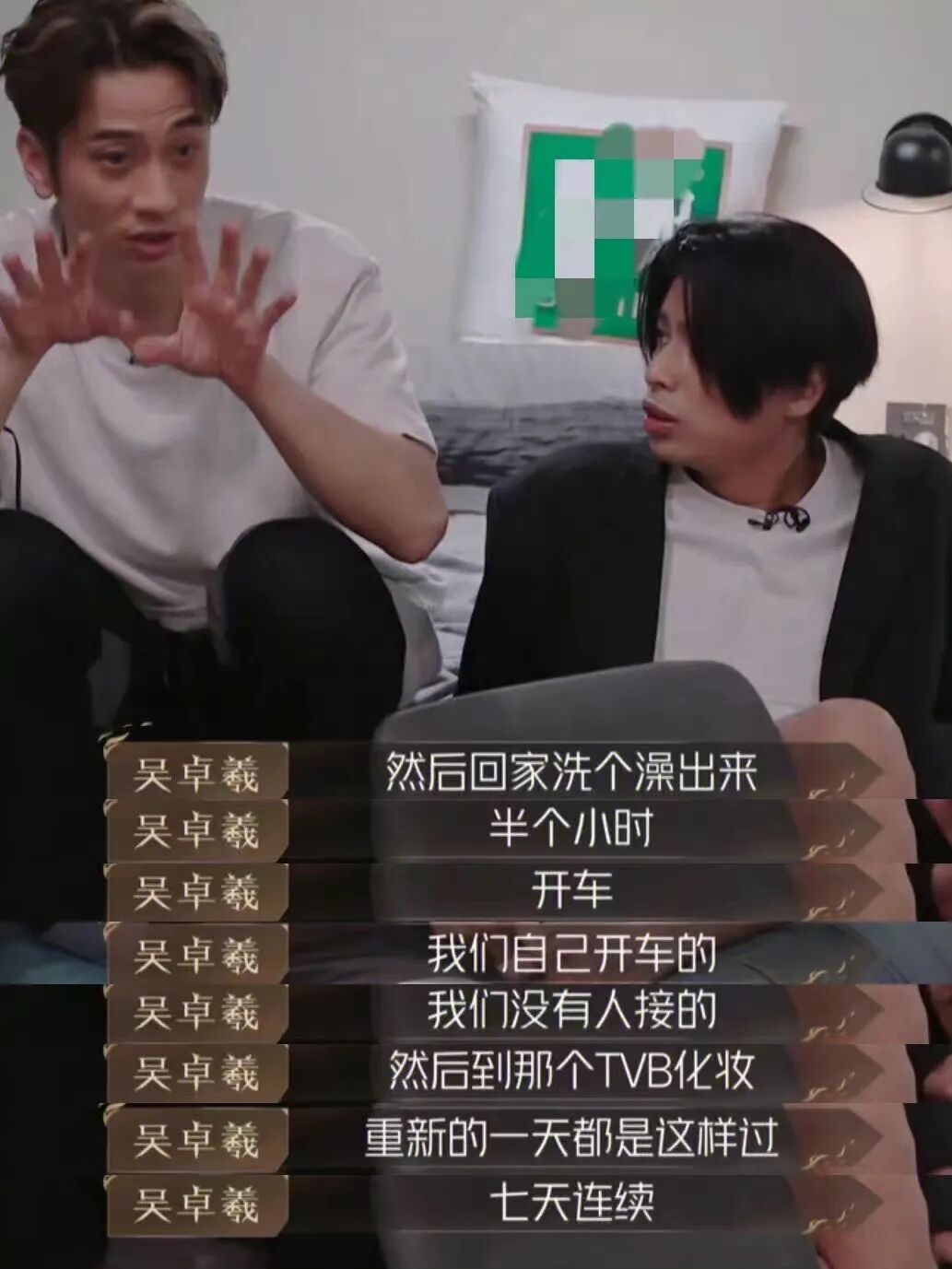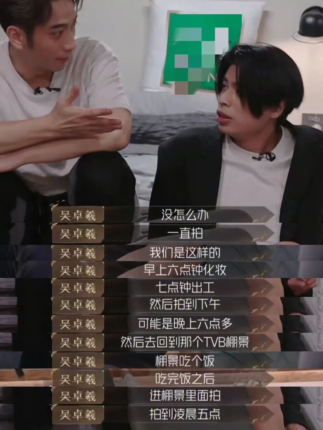 节目里提及TVB时期的演艺生涯,吴卓羲说:“我最长时间七天没睡觉,早上六点钟化妆,七点钟出工,然后拍到下午,可能是晚上六点多,然后回到那个TVB棚景吃饭,之后进棚景里面拍,拍到凌晨五点,然后回家洗个澡出来,半个小时,开车半个小时,然后到TVB化妆,重新的一天都是这样过。”