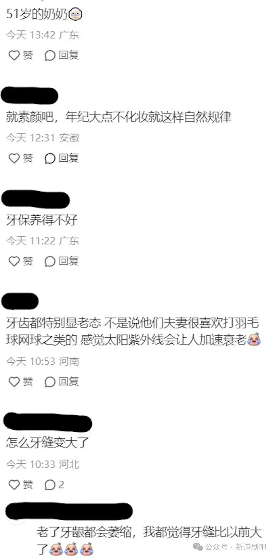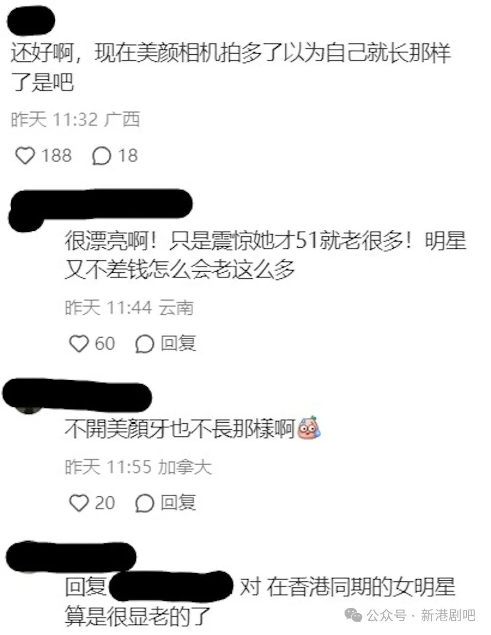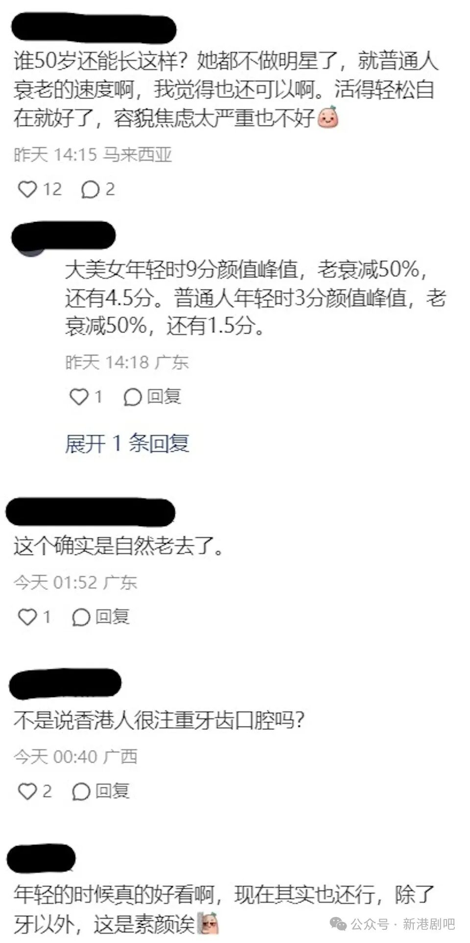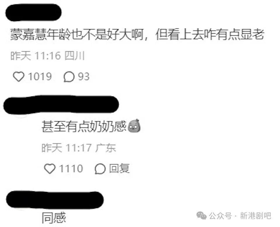 不过不少网民却将焦点放在蒙嘉慧的外貌上,纷纷留言感叹她近年颜值大跌Watt,急速衰老:“年纪也不是很大啊,但看上去咋有点显老”、“甚至有点婆婆感”、“很漂亮,只是震惊她才51就老了很多!明星又不差钱怎么会老这么多”、“在香港同期的女明星算很显老的了”,但亦有不少人支持蒙嘉慧只是自然老去:“谁50岁还能这么长?她也不做明星了,就普通人衰老的速度啊,我觉得也可以啊”,“素颜吧,年纪大了怎么不化妆就这样,自然规律”。