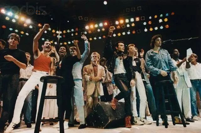 十几万人在温布利球场观看 十几万人在费城肯尼迪体育场观看 全球 150 多个国家观众通过电视观看 会有十三个卫星用来直播 奥运会也只用了三个