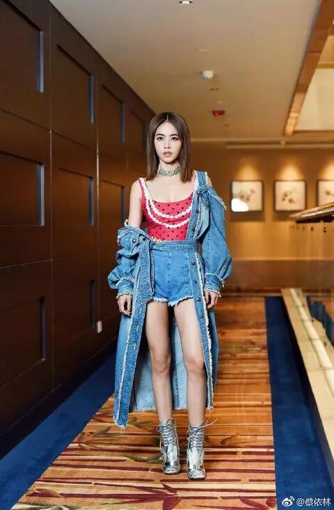之后又换成了一条高腰牛仔短裤和一个长外套。