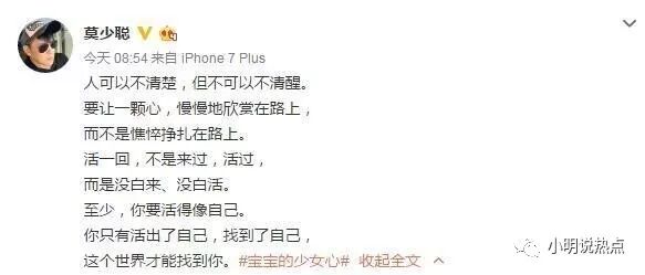 比较值得注意的是,在洪欣凌晨完成第一个动态后不久,她的前男友莫少冲也在社交平台上更新了动态,发文:“人可以不清楚,但不能不清醒……”看到莫少冲的动态,很多人说是在隔空喊洪欣要清醒。的确很多时候都是“旁观者清,当局者迷”,更不用说能让人沉浸在无法自拔的爱中,有些东西作为情感方面真的看不到。虽然目前尚不清楚洪欣在本帖中的抱怨是否涉及情感问题,但有一点可以肯定,洪欣确实遇到了一些麻烦,不知道如何解决。希望洪欣能和身边的亲朋好友交流,倾听别人的意见,也许就会思想开放,问题也会相应解决。