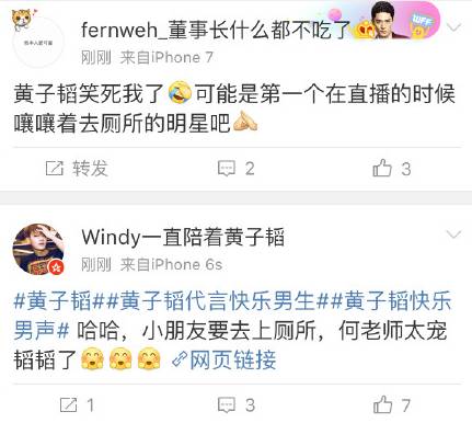 快男五进四比赛直播的时候,现场一片紧张,结果黄子韬举手跟何炅报告:何老师我想上厕所!我真的憋不住了!”