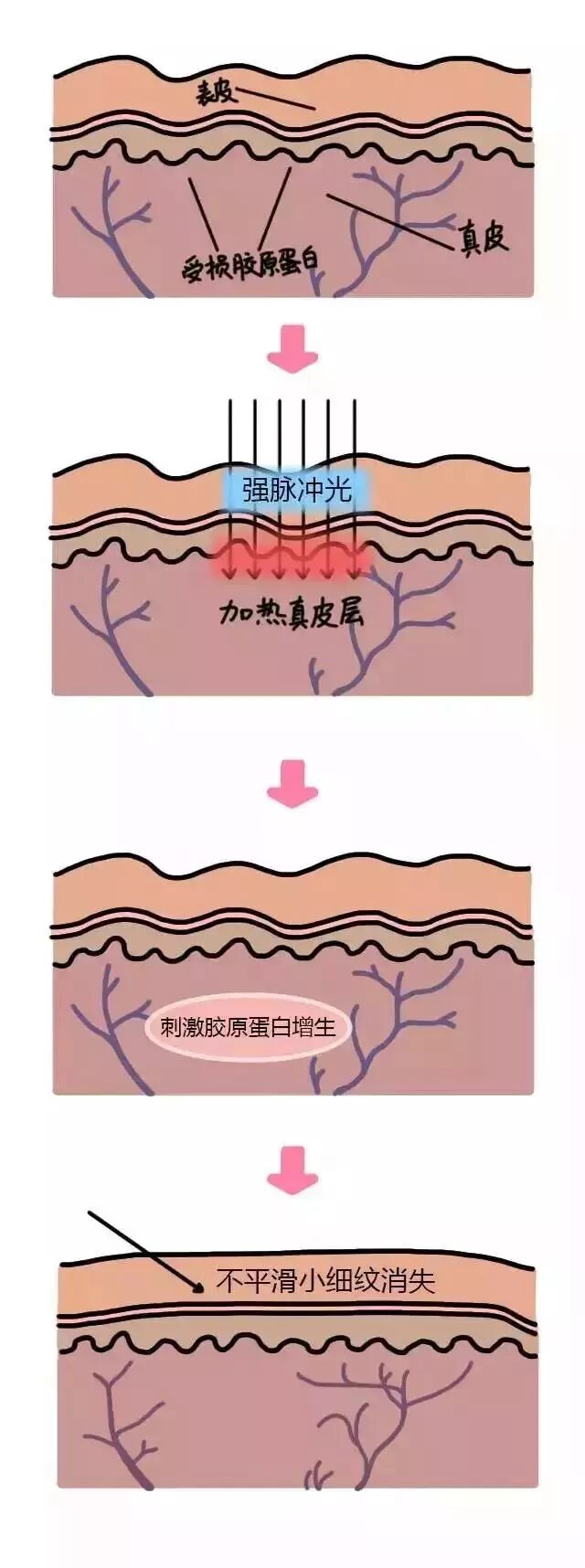 光子嫩肤是采用特定的宽光谱彩光,直接照射于皮肤表面。它可以穿透至皮肤深层,选择性作用于皮下色素或血管,分解色斑,闭合异常的毛细血管。同时光子还能刺激皮下胶原蛋白的增生。