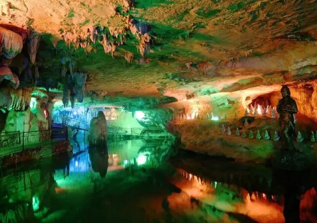石钟乳琳琅满目瑰丽多姿,晶莹透亮色彩斑斓。