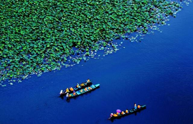 当然,也可以泛舟于蓝天碧水中,桨声倒影,就此误入藕花深处。