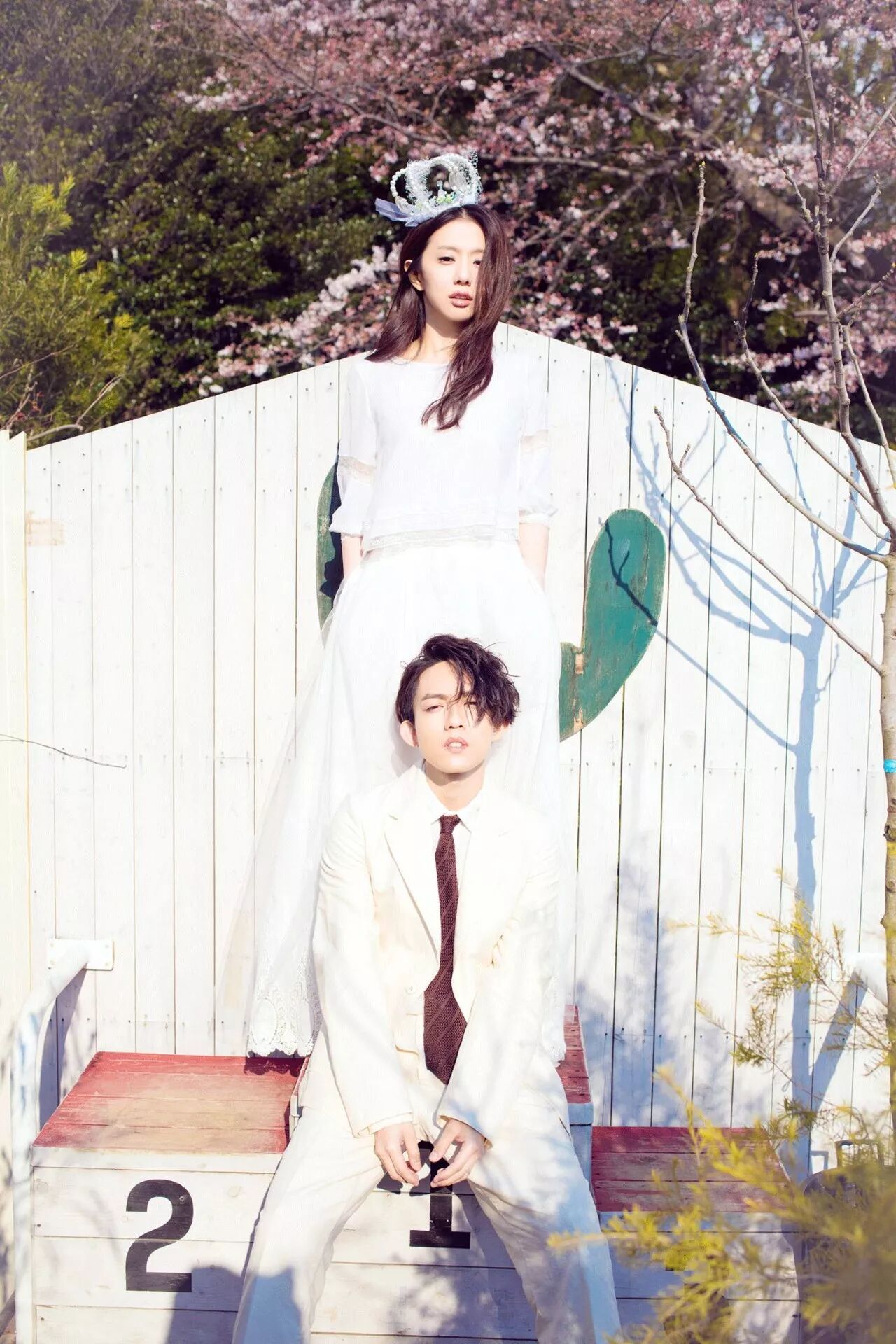 在樱花树下拍婚纱照,林宥嘉穿着牛仔裤运动鞋,丁文琪的“婚纱”也只是在牛仔裙外面套了一层白纱而已。