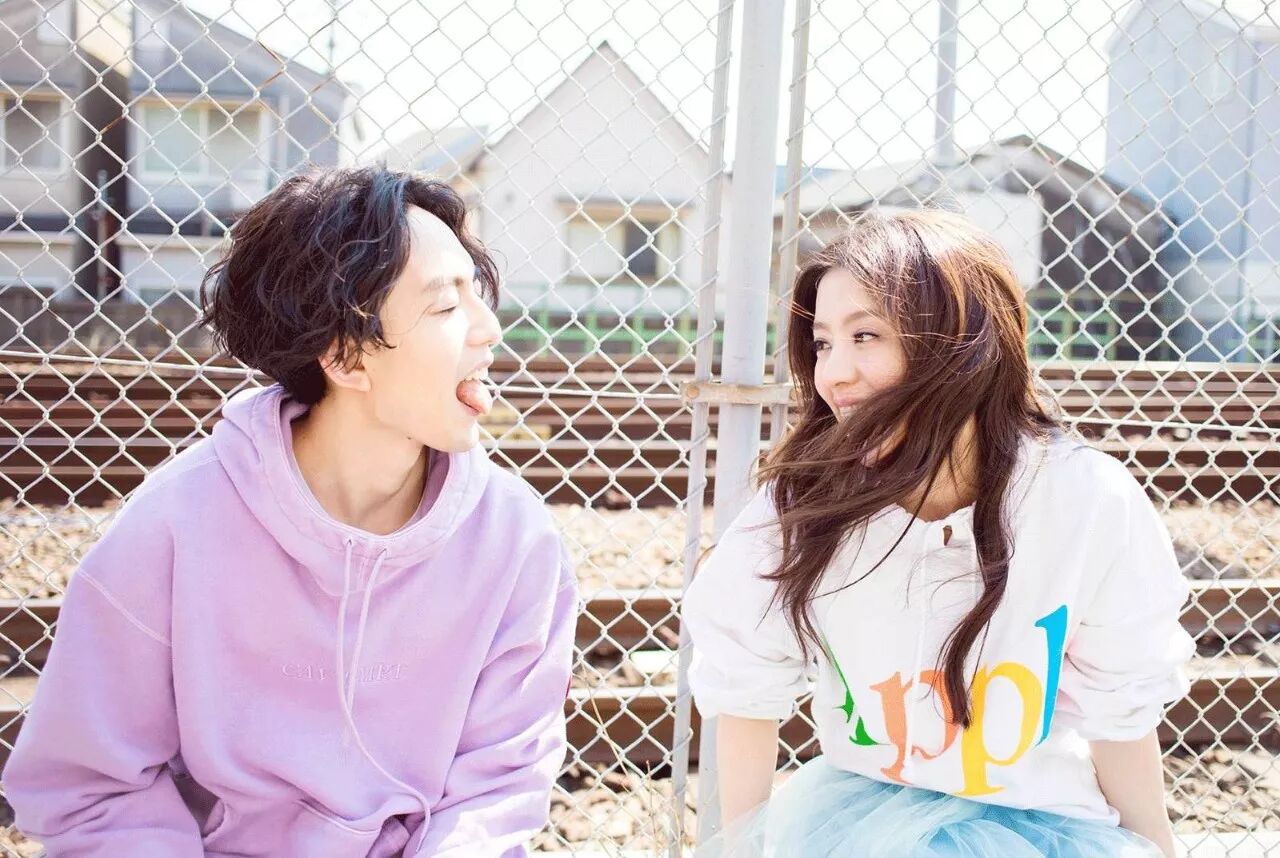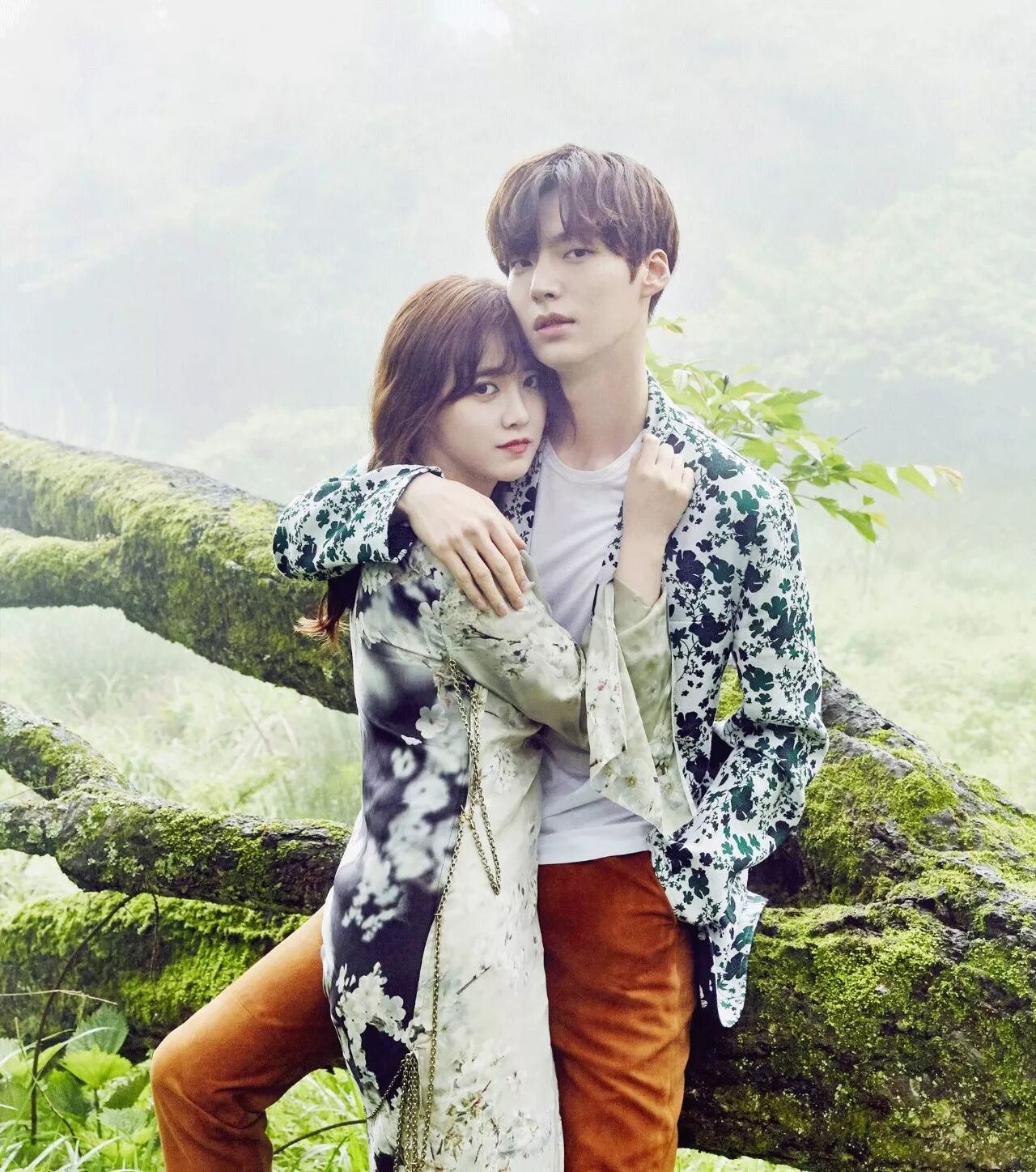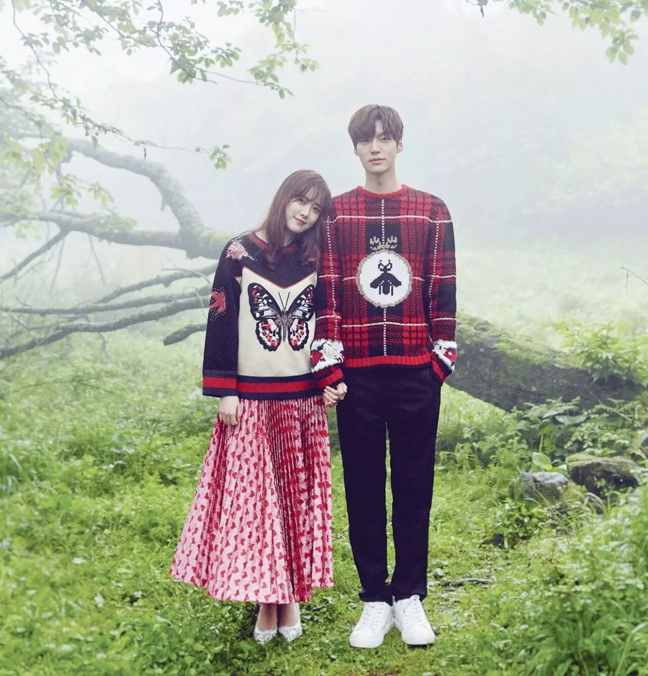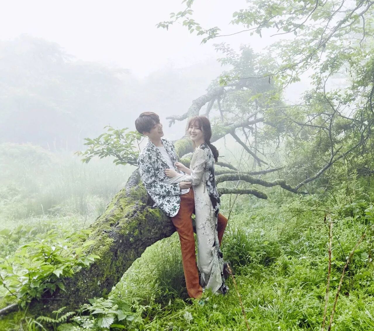 本来他们俩站一起就会有一种清风拂面的感觉,还把拍摄地点选在济州岛的一个森林里,再配上印有小碎花的衣服,生活在仙境里不食人间烟火的仙女和仙子大概就是这样吧。