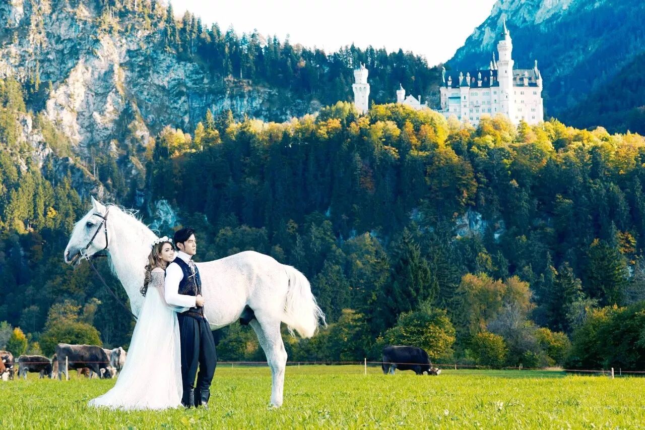 也有在法国枫丹白露宫拍的,这里是历代法国的君主的皇家宫殿,站在皇宫里的他们一个是穿着Dolce&Gabbana的王子,一个是穿着品牌高定婚纱的公主。