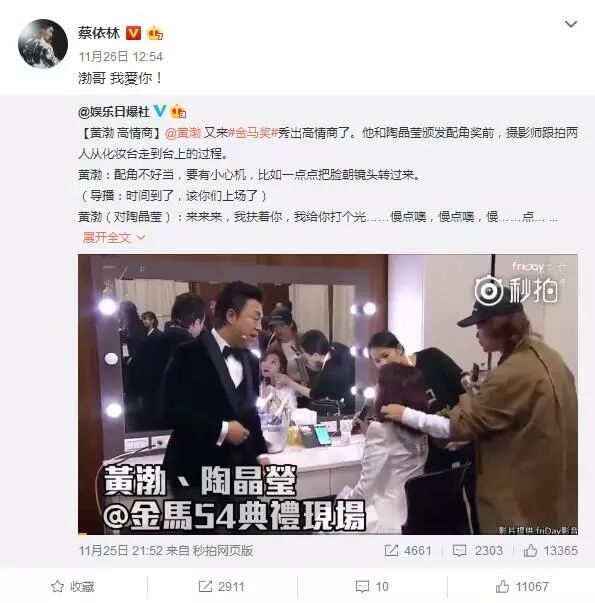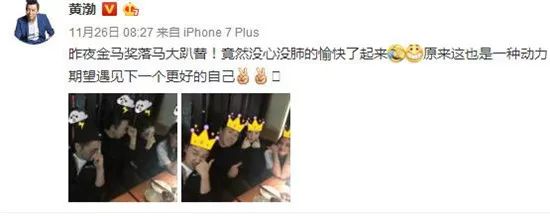 黄渤虽然错失金马影帝,但人气不减。蔡依林甚至直接喊话:“渤哥,我爱你!”而黄渤也发微博表示:“原来这也是一种动力,期望遇见下一个更好的自己。”