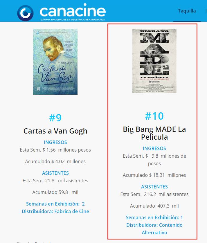 《BIGBANG: MADE THE MOVIE》 电影在墨西哥上映,位列墨西哥票房第10位。该片是进入该排名的首部Kpop电影,同时也是第二部韩国电影,第一部为《釜山行》。
