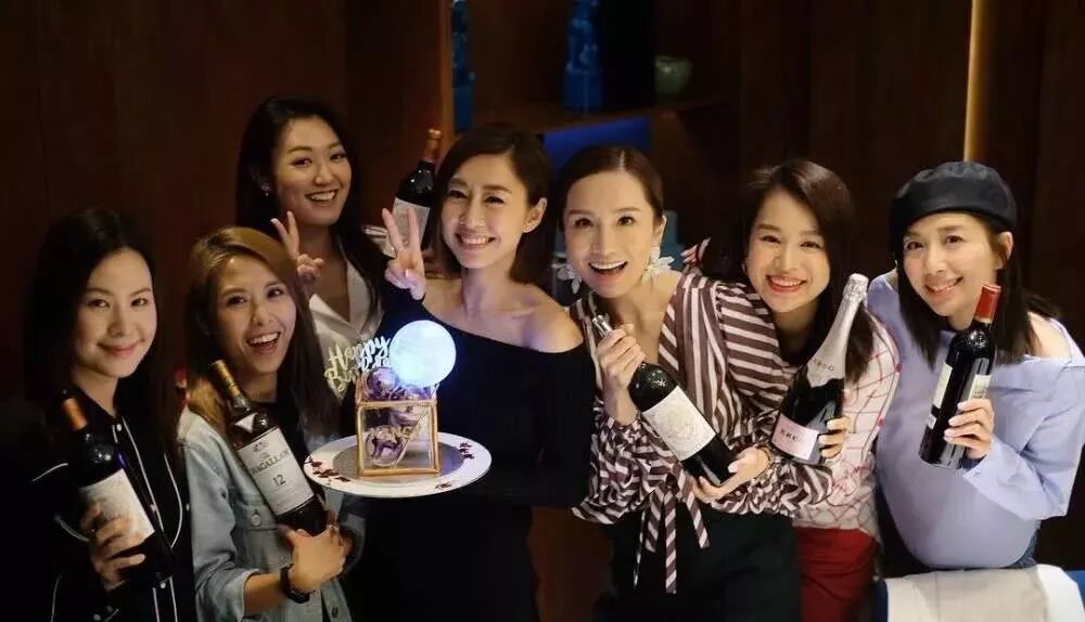 难得这么齐人她们肯定要狂欢啦,寿星女胡定欣拿着生日蛋糕站在中间,而其他姐妹就一人拿着一支红酒,相信昨晚肯定是不醉不归了。