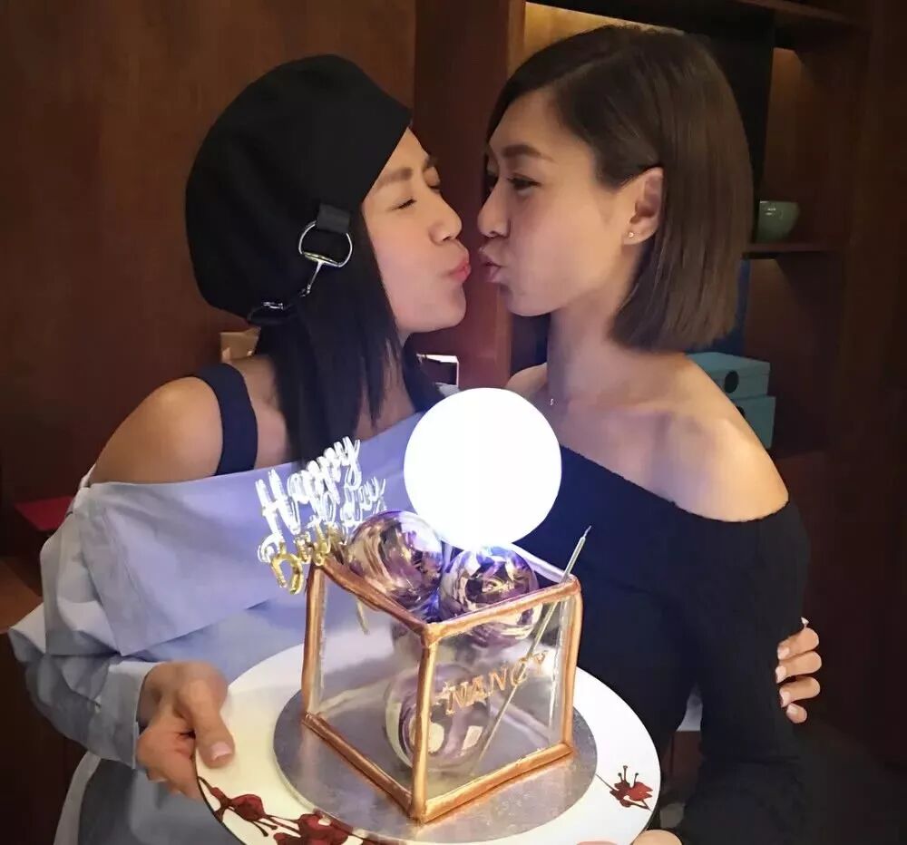 黄智雯和胡定欣的亲密合照,她们都用一只手拿着蛋糕,黄智雯用另外一只手搂着胡定欣的手臂。黄智雯闭着眼睛嘟嘴亲吻寿星女,而胡定欣也嘟着嘴巴回应黄智雯。