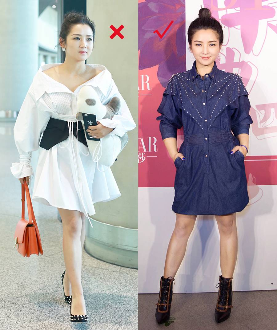 ▲陈乔恩虽说是吃可爱多长大的,但她的苦恼是上围丰满,所以稍微穿不好也很容易显胖,左边的这样毛昵裙让她看上去很臃肿,而右边的这件却看去瘦了一大圈,关键在于面料和腰线!