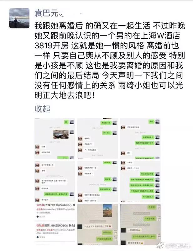 然后指出张雨绮5日晚与刚认识两天的男子开房,特别说明:“这是她的一贯风格,离婚前也一样,只要自己爽从不顾及别人的感受,特别是不顾小孩”……