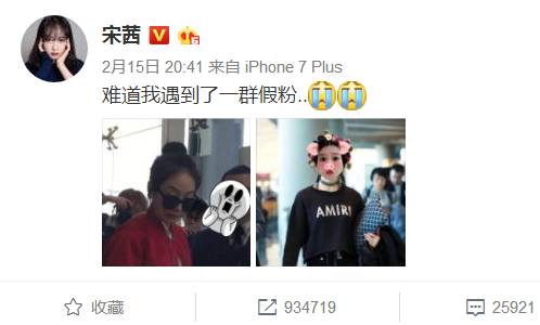随后宋茜发了微博,“吐槽”粉丝们:难道我遇到了一群假粉?