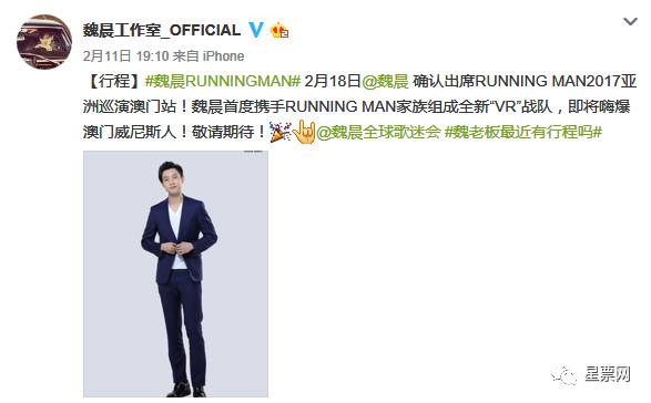 魏晨工作室也公布确认魏晨将出席2月18日在澳门举行的《RUNNING MAN》粉丝见面会,担任嘉宾。