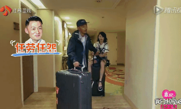 任劳任怨拿箱子,拉着坐在箱子上的周冬雨