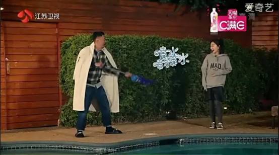 周冬雨用切磋武功的借口约余文乐在泳池见面,没想到余文乐真的身披“战袍”(浴袍),还拿着会喷水的东西来玩耍