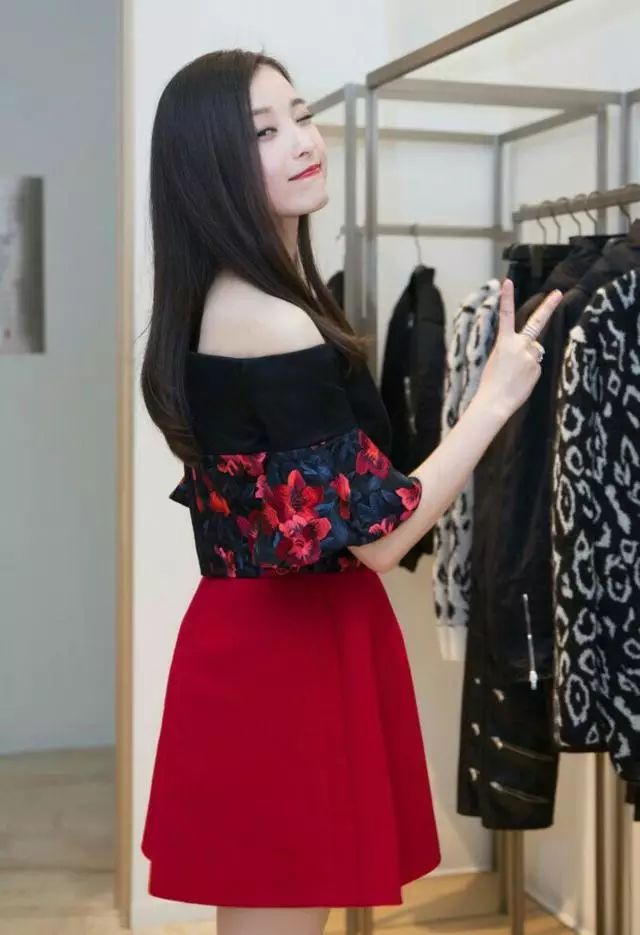 >>>复古印花的蕾丝花朵,搭配大红色半身裙,上衣露肩的款式,性感又时尚。