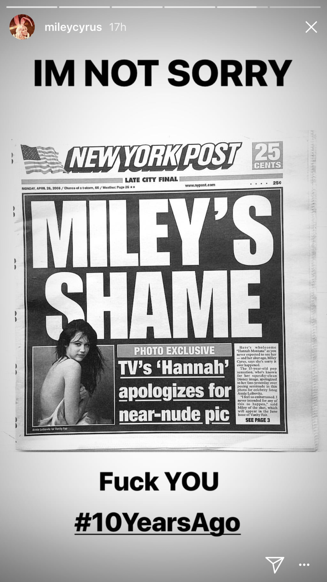 Miley Cyrus在未成年的时候就为自己的一张露背照片道歉,甚至还被《New York Post》以“麦莉的耻辱”为标题挂上封面进行报道。