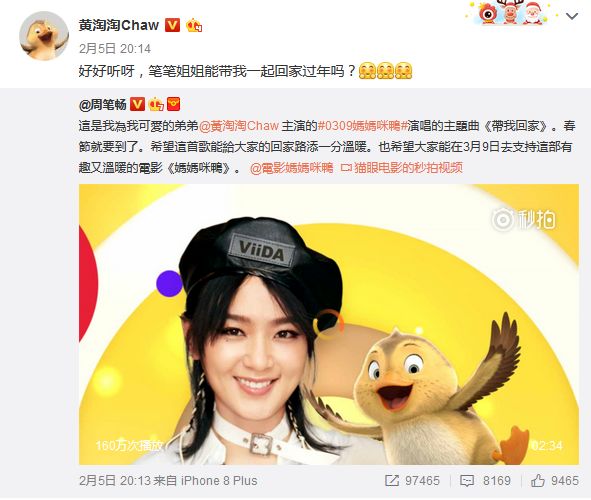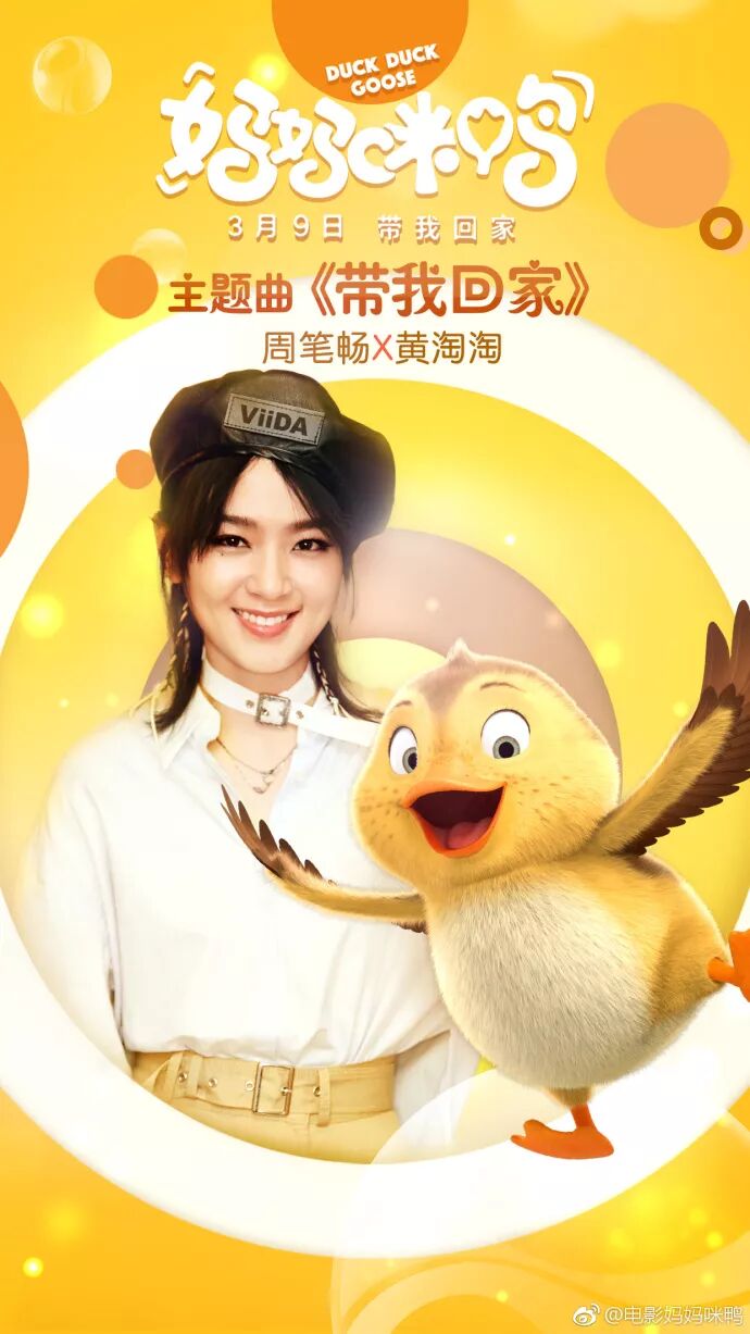萌鸭黄淘淘主演的动画电影《妈妈咪鸭》将于2018年3月9日全球上映,昨晚周笔畅的微博发布了为黄淘淘打call献唱的《妈妈咪鸭》主题曲《Thunder to the Ground》(带我回家)