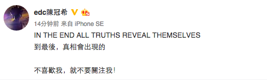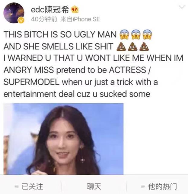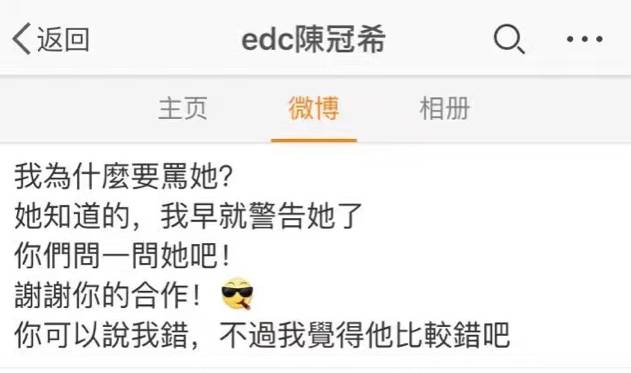 这一次还贴心贴上了翻译,知名导演邱瓈宽(宽姊)回应陈冠希贴文,并表示:「会不会是骇客入侵?如果真是本人⋯告诉你台湾艺人没那麽好欺负⋯何况是志玲!从未与人结怨!那你不要再出现在台湾!!!我保证见你一次打你一次!干!!!」都是成年人了,莫冲动,时间继续发酵,所长贴几个传言,大家随意感受一下↓