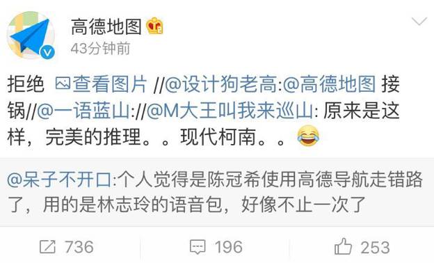 哎,大半夜的这么多小伙伴在玩我猜我猜我猜猜猜游戏,所长掐指一算,好像知道了真相:个人觉得是陈冠希使用高德导航走错路了,用的是林志玲的语音包,好像不止一次了。