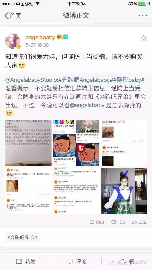 5月27日angelababy发微博称:知道你们很爱六娃,但谨防上当受骗,请不要购买人家。让我们看看都有哪些奇葩们购买了葫芦娃。
