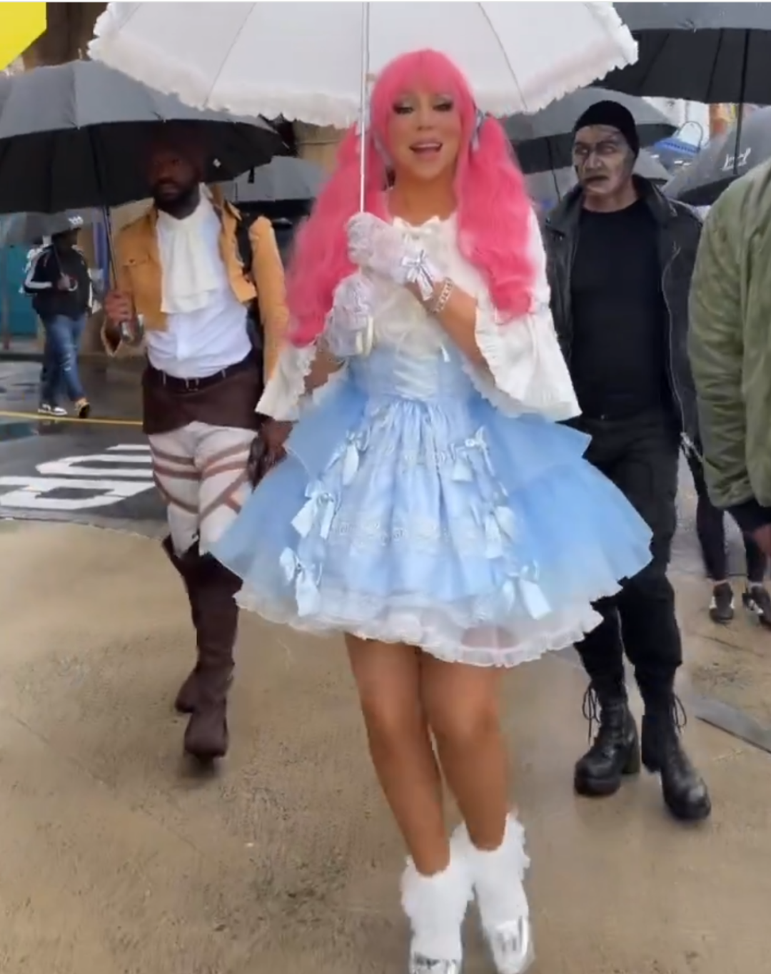 Mariah Carey(玛丽亚·凯莉)今年万圣节的造型二次元少女,她穿着华丽洛丽塔风格服饰戴着一定粉色假发。