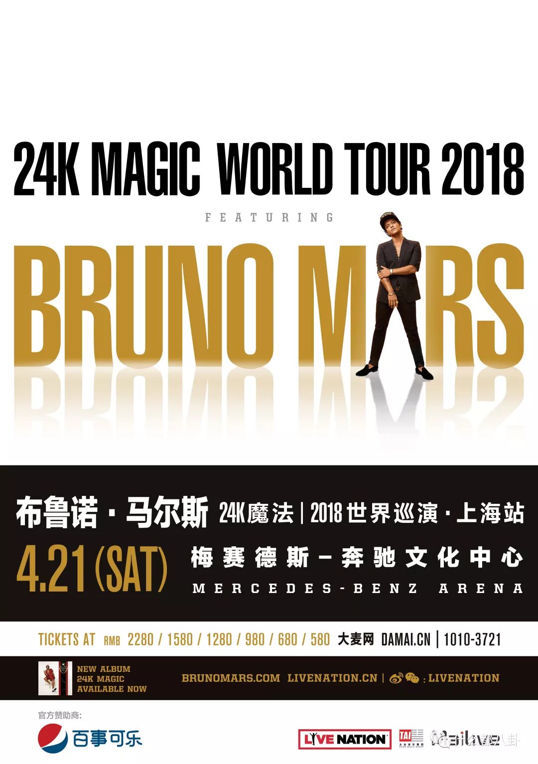 (2018 2月1日,中国上海) - Live Nation今日重磅宣布,格莱美奖得主、获多张白金唱片认证,红遍全球的超级巨星Bruno Mars将为中国粉丝带来他最新的24K 魔法 2018全球巡演,并将于2018年4月21日在上海梅赛德斯-奔驰文化中心火爆开唱!