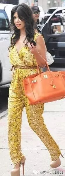 Kourtney Kardashian 把柠檬黄的印花连身裤和橘色柏金包撞在一起,好不热闹。