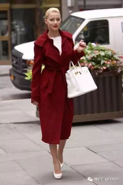 Amber Heard 这一身酒红色大衣煞是好看,加上一只纯白铂金包仿佛40年代的好莱坞女影星。