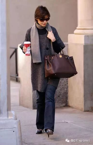 Katie Holmes 浓郁的巧克力色铂金包适合秋冬季节。