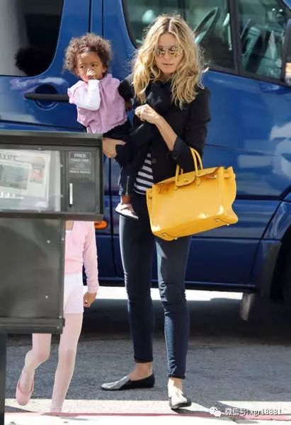 Heidi Klum 辣妈超模Heidi Klum和她家宝贝出游时也拎着让人心情愉快的柠檬黄色铂金包。